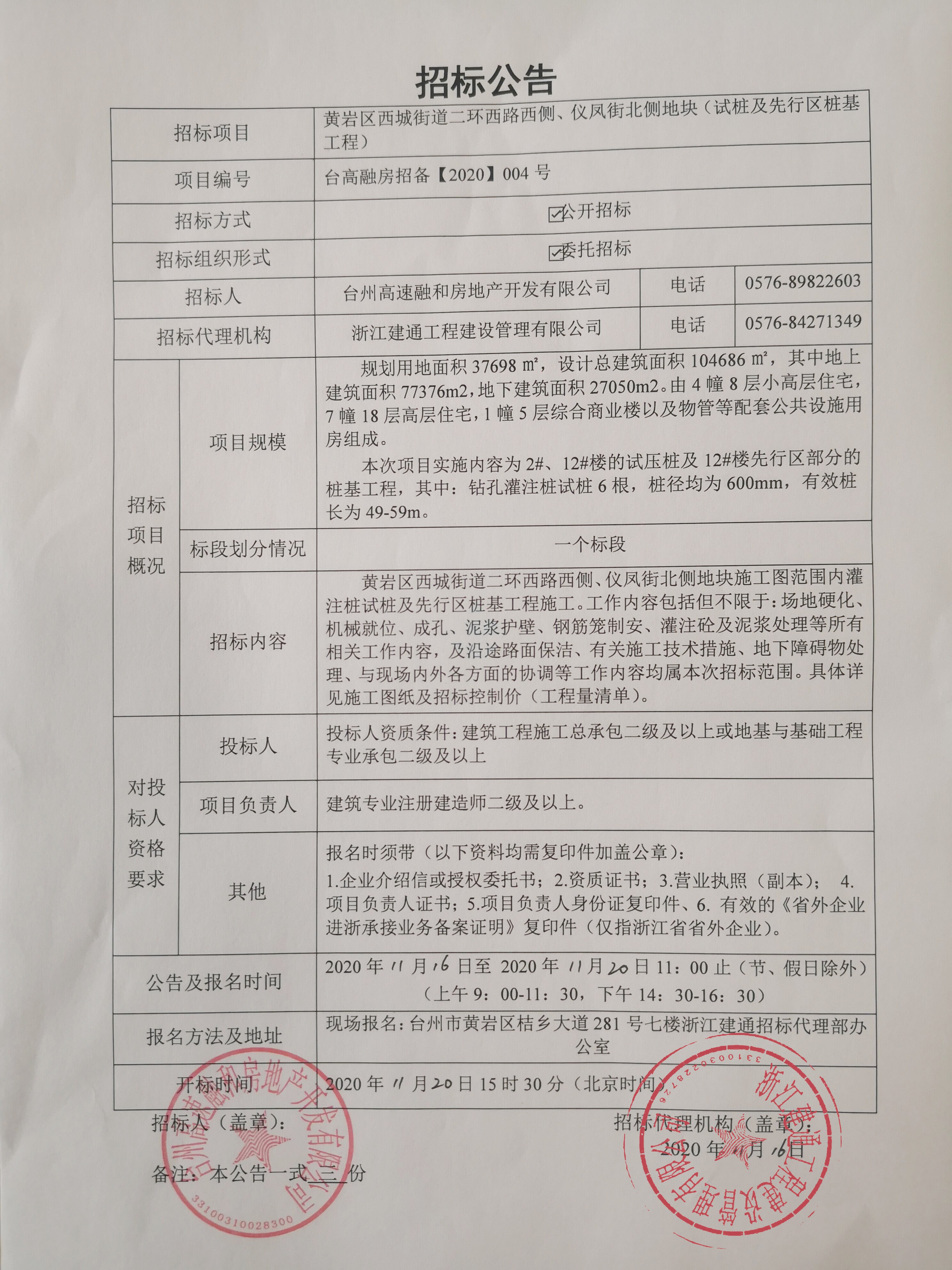 黃巖區(qū)西城街道二環(huán)西路西側、儀鳳街北側地塊(試樁及先行區(qū)樁基工程)招標公告