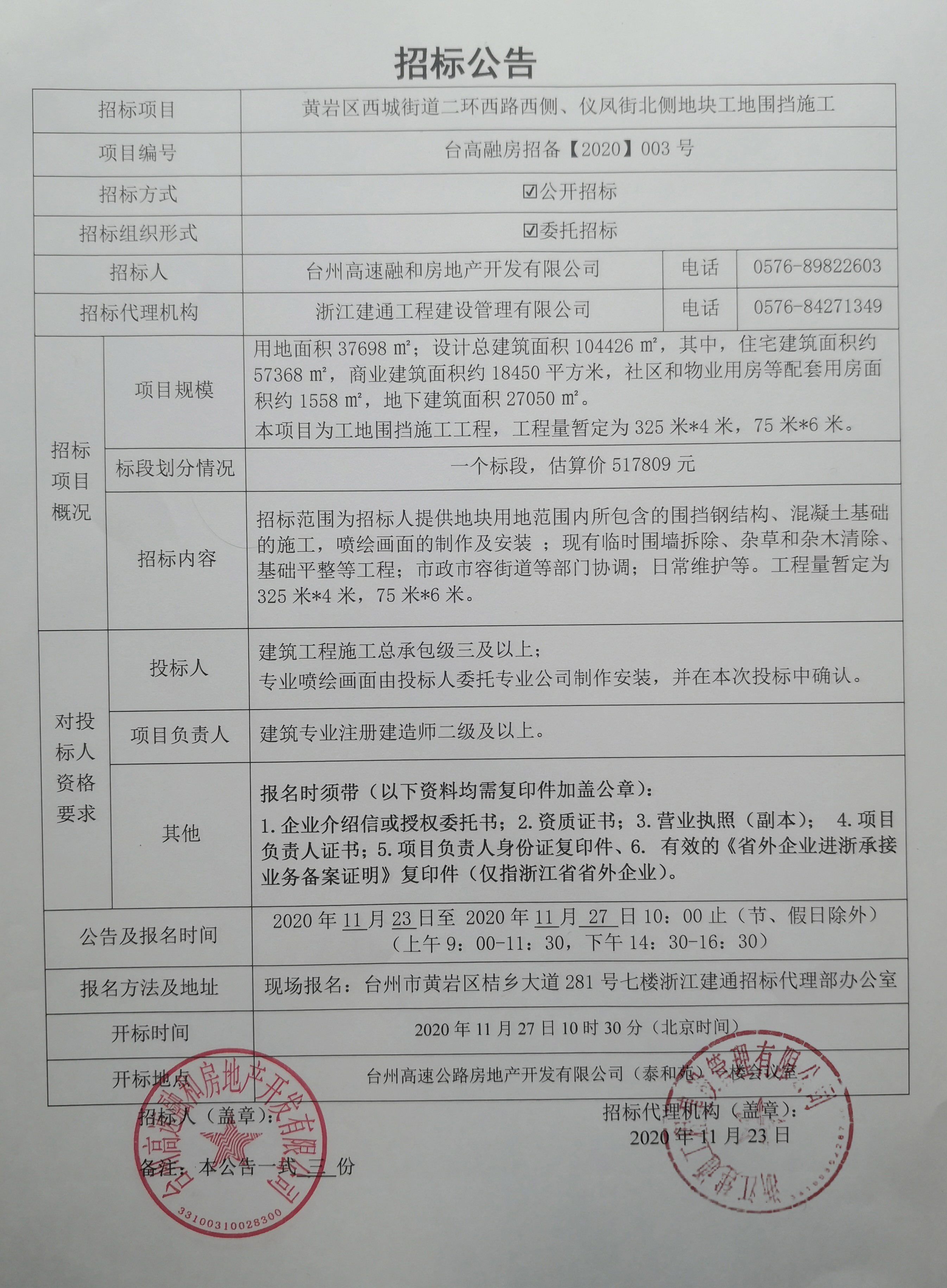 黃巖區(qū)西城街道二環(huán)西路西側(cè)、儀鳳街北側(cè)地塊工地圍擋施工招標(biāo)公告