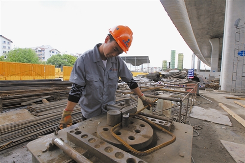馬進(jìn)學(xué)告訴記者,在鋼筋工這么多道工序里,將加工好的半成品鋼筋通過彎曲機(jī)制作成型是一道需要細(xì)心和耐心俱備的工序,無論是加工時的站位還是彎曲點(diǎn)的選擇都是對一個鋼筋工技藝的考驗(yàn),所以工作的時候必須集中精神格外小心。