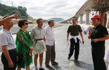 圖為在6#立交上了解工程建設(shè)情況 老干部一行實地踏勘了內(nèi)環(huán)路(黃巖段)各施工現(xiàn)場,全面了解了四個標(biāo)段工程當(dāng)前建設(shè)情況。一路上,老干部們一面聽取各標(biāo)段工作匯報,一面用手機(jī)相機(jī)記錄現(xiàn)場當(dāng)前建設(shè)情況,當(dāng)知道今年11月11日內(nèi)環(huán)路將實現(xiàn)主線通車時,老干部們紛紛豎起大拇指,為內(nèi)環(huán)路建設(shè)的進(jìn)度和質(zhì)量點贊,同時表示將多走多看,為內(nèi)環(huán)建設(shè)盡自己的一份力。 鐘彪對老干部們的關(guān)心和支持表示衷心感謝,并希望各位老干部多指導(dǎo)、多監(jiān)督、多提寶貴意見,助力臺州城市建設(shè)趕超發(fā)展。 張琛